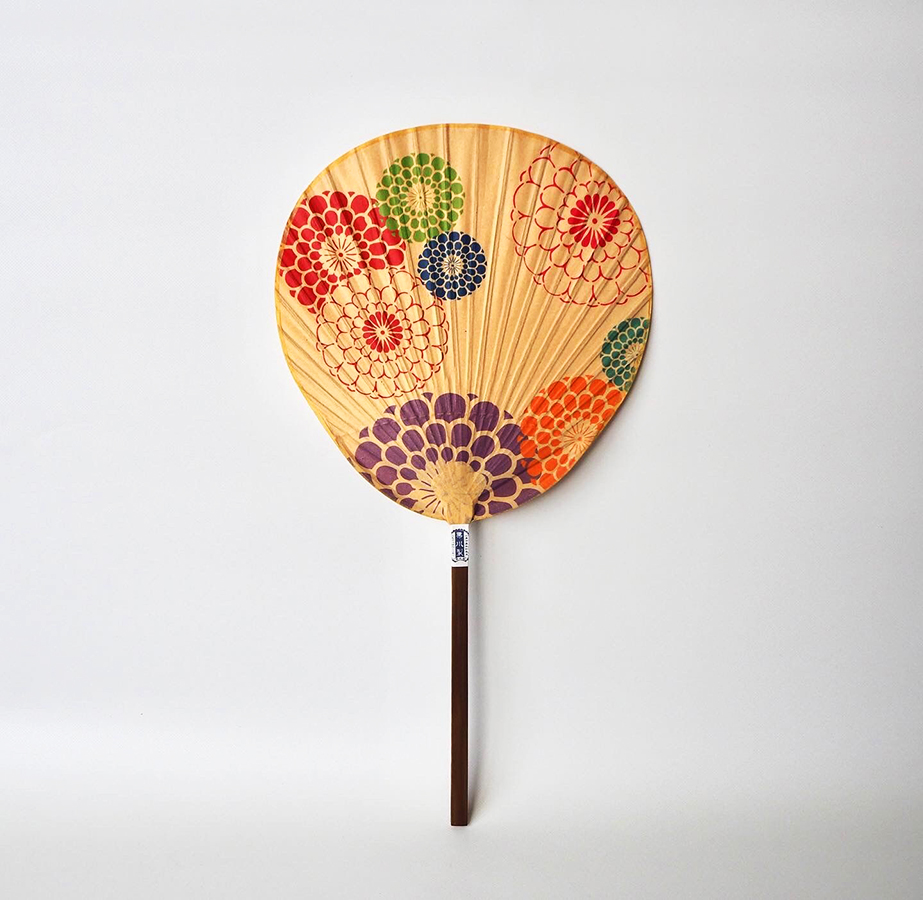 The uchiwa fan is hand made by Japanese washi paper coated with persimmon tannin and affixed to a bamboo handle.
