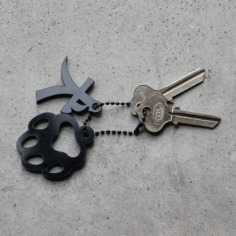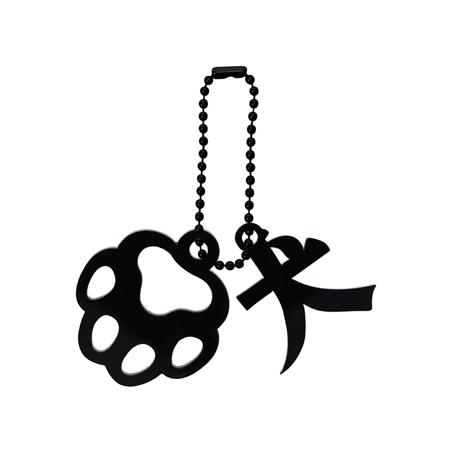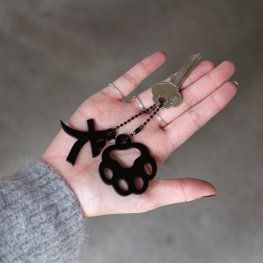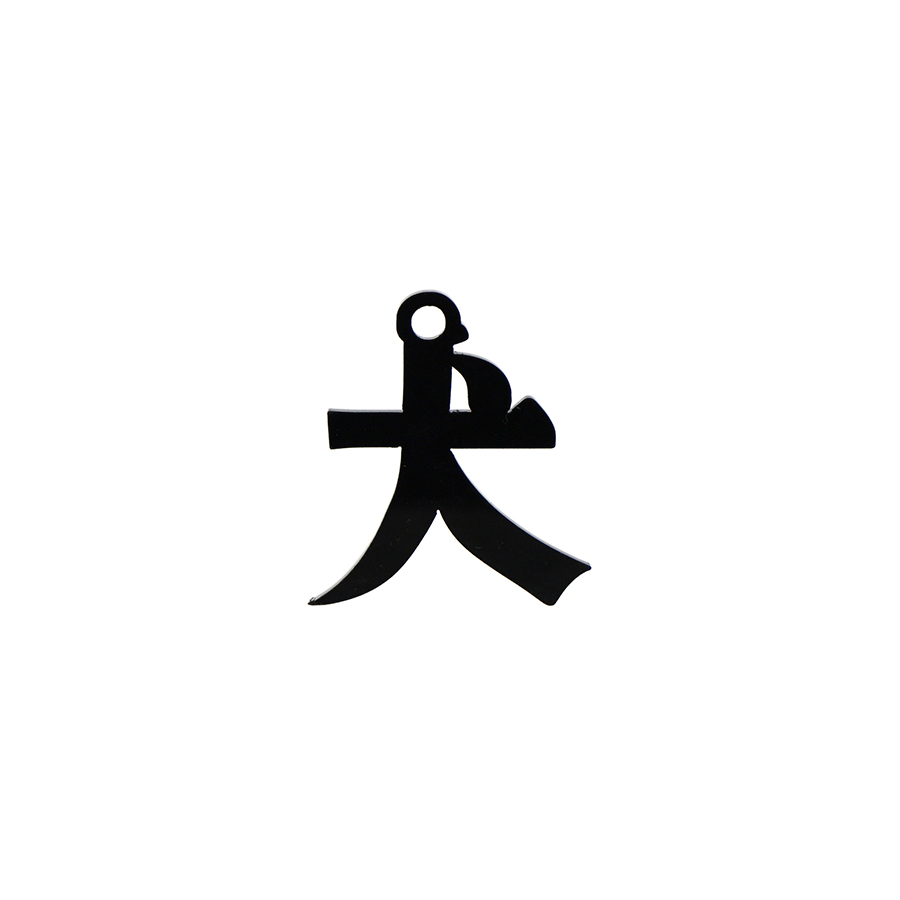 This acrylic keychain combines the kanji character for dog, a silhouette motif and a ball chain.