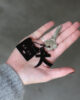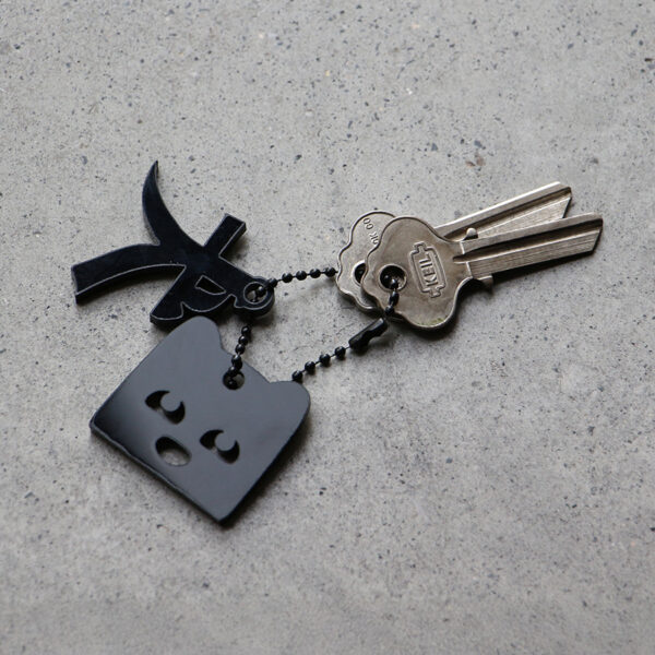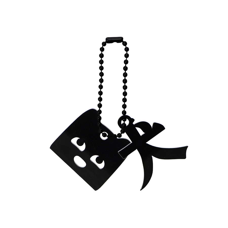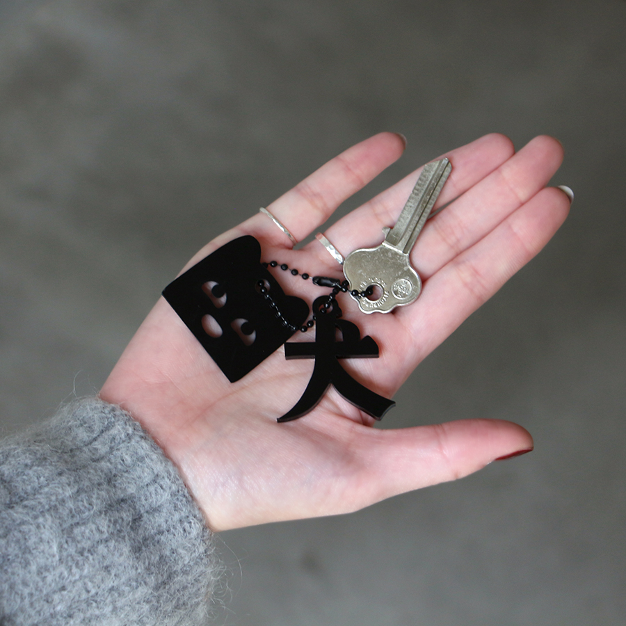 This acrylic keychain combines the kanji character for dog, a silhouette motif and a ball chain.